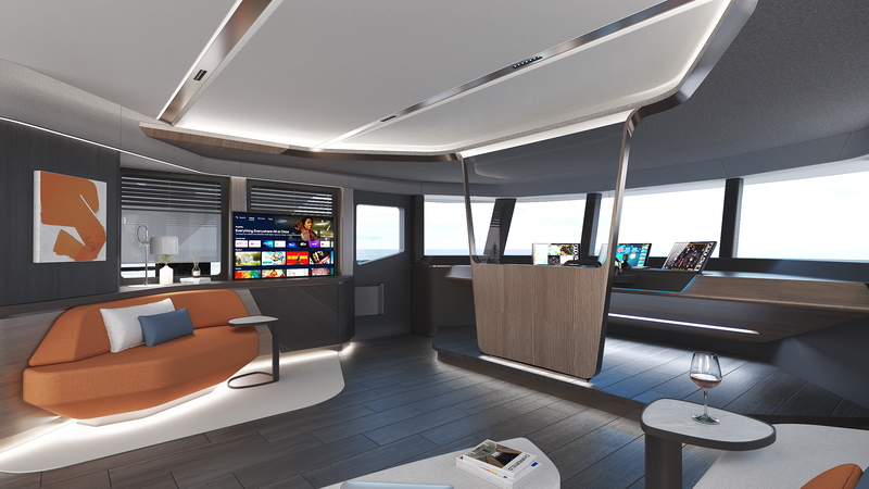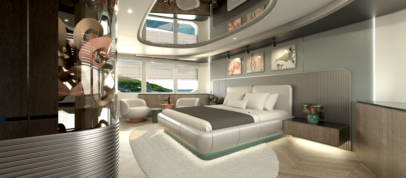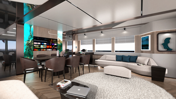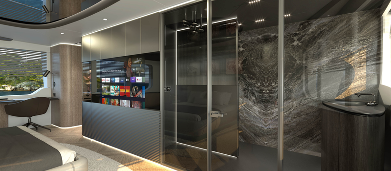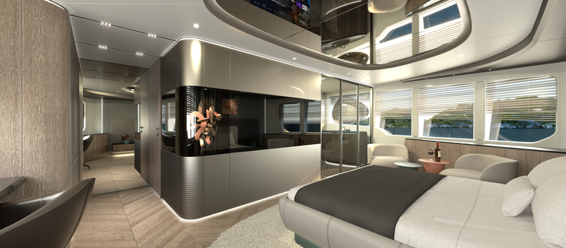 Standart iç mekan düzeni, ana güvertede öne konumlandırılmış geniş bir master süit dahil olmak üzere dört misafir kamarasından oluşmaktadır.