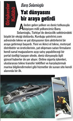Aileden gelen yelken ve deniz tutkusuyla büyüyen milli yelkencimiz Barış Selamioğlu, Türkiye’de denizcilik sektöründeki büyük bir eksiği doldurdu. Kurduğu yatvitrini.com adresinde tekne ve yat dünyasının tüm aktörlerini bir araya getirmeyi başardı.