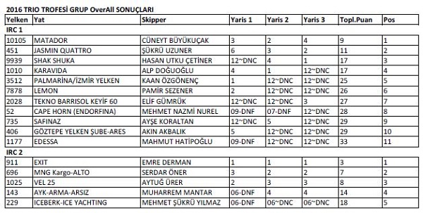 Yarışmanın genel klasmanında; Cüneyt Büyükuçak ve ekibinin bulunduğu “Matador” teknesi, IRC 1 sınıfında birinciliği göğüsledi. IRC 1 sınıfında ikinciliği ise, Jasmin Quattro yelkenlisi ile Şükrü Uzuner ekibi elde etti. IRC 2 sınıfında Emre Derman ve ekibi “Exit” teknesiyle birinci oldu. Sınıfın ikinciliğini ise, MNG Kargo - Alto yelkenlisi ile Serdar Öner ekibi kazandı.