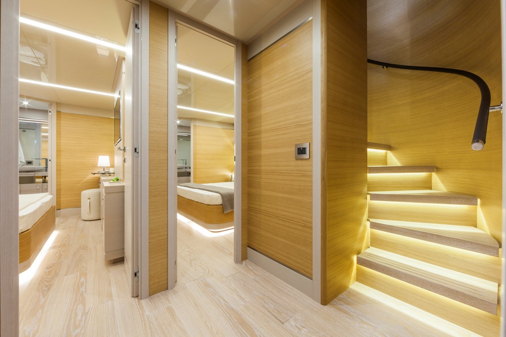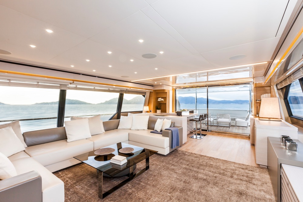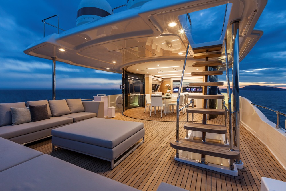 Birçok ayrıntıyı birleştiren estetik özellikleri ve fonksiyonel çözümler arasında örneğin, üst güvertede panoramik yemek salonunda bulunan dairesel sürgülü camlı kapı sistemi bu alanda çok esnek bir kullanım sağlıyor. Geniş güneşlenme alanı yat sahibi ve konukları için özel bir bölüme sahip ve bu bölüme isteğe bağlı olarak jakuzi ve tente konulabiliyor.