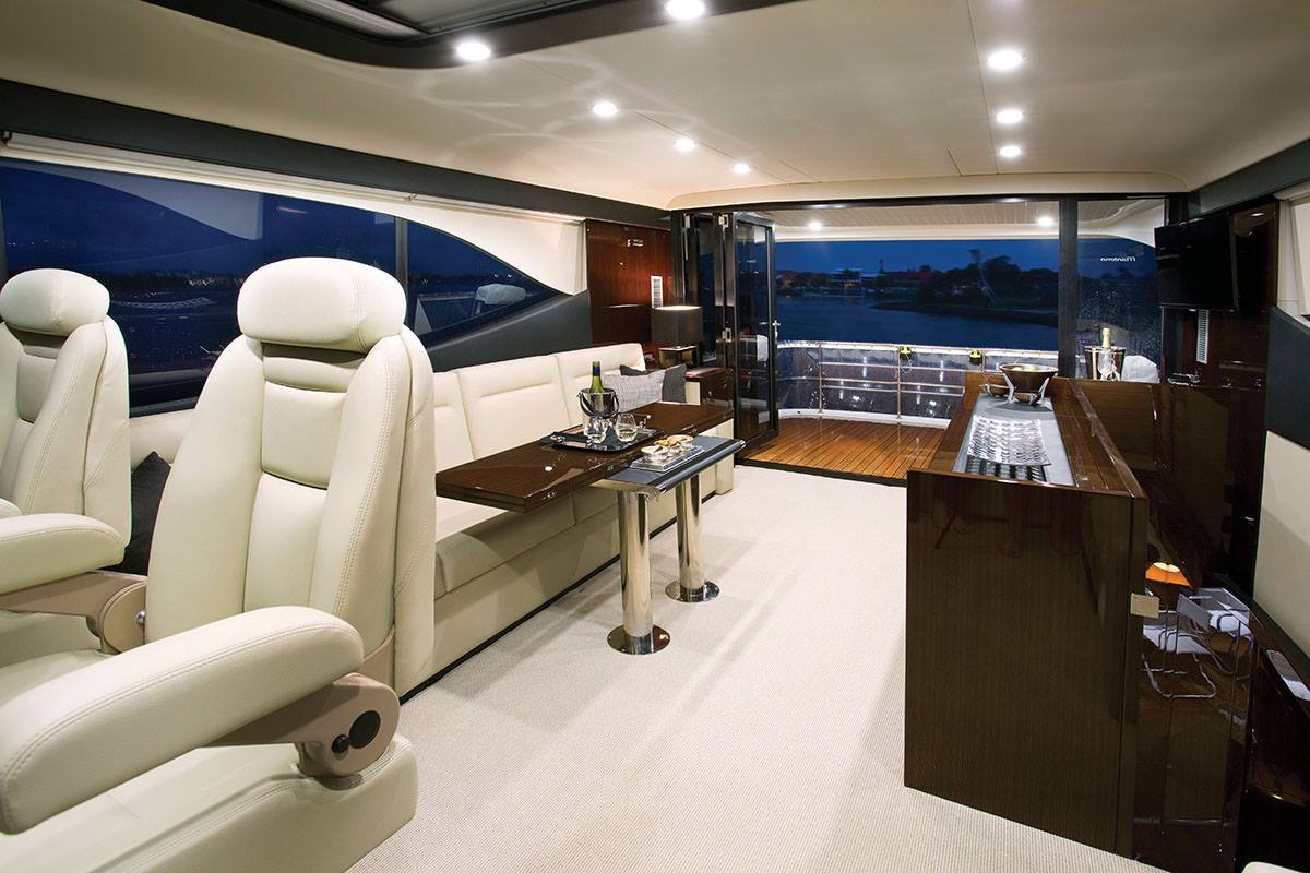 M65 motoryatın salonunda yer alan flybridge merdiveni, alışılagelmişin dışında oldukça geniş şekilde tasarlanmış. Açılır kapanır koltuklar, yerleri değişebilir masalar ve büyük wet barı ile seyir halindeyken adeta evinizdeymişçesine his oluşturmaya yetiyor.