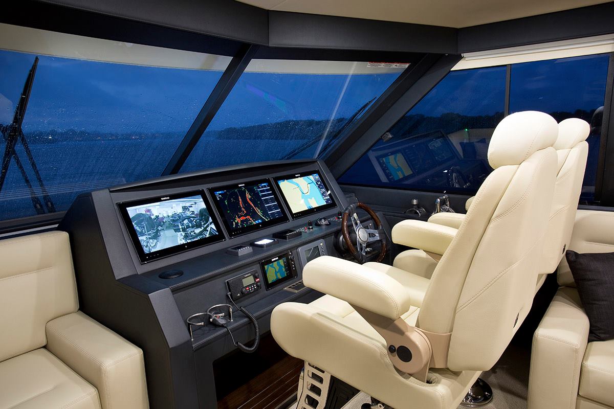 Kapalı flybridge alanıyla farklı karakterini ilk etapta göze çarpan M65’in tasarımı, bu üst güverte katında bulunan tek dümen istasyonuyla hem alt güvertedeki yaşam alanını genişletmiş oluyor hem de çok daha fazla hakimiyet hissi uyandıran bir dümen evi sunuyor. M65’in bu kapalı flybridge’i firma tarafından ‘skylounge’ olarak adlandırılıyor. Bu güvertede sadece dümen istasyonu bulunmuyor: Son derece konforlu oturma grubu, kokteyl masası ve wet bar kabini de yine bu güvertede düşünülmüş. Elektrikli açılır tavan, 24 bin BTU’luk havalandırma ve iklimlendirme sistemi yine bu kapalı flybridge’in özellikleri arasında. Flybridge güvertesinin kapalı alanının özelliklerinin ötesinde kıç tarafta tasarlanmış olan açık balkon kısmını da atlmamakta fayda var.