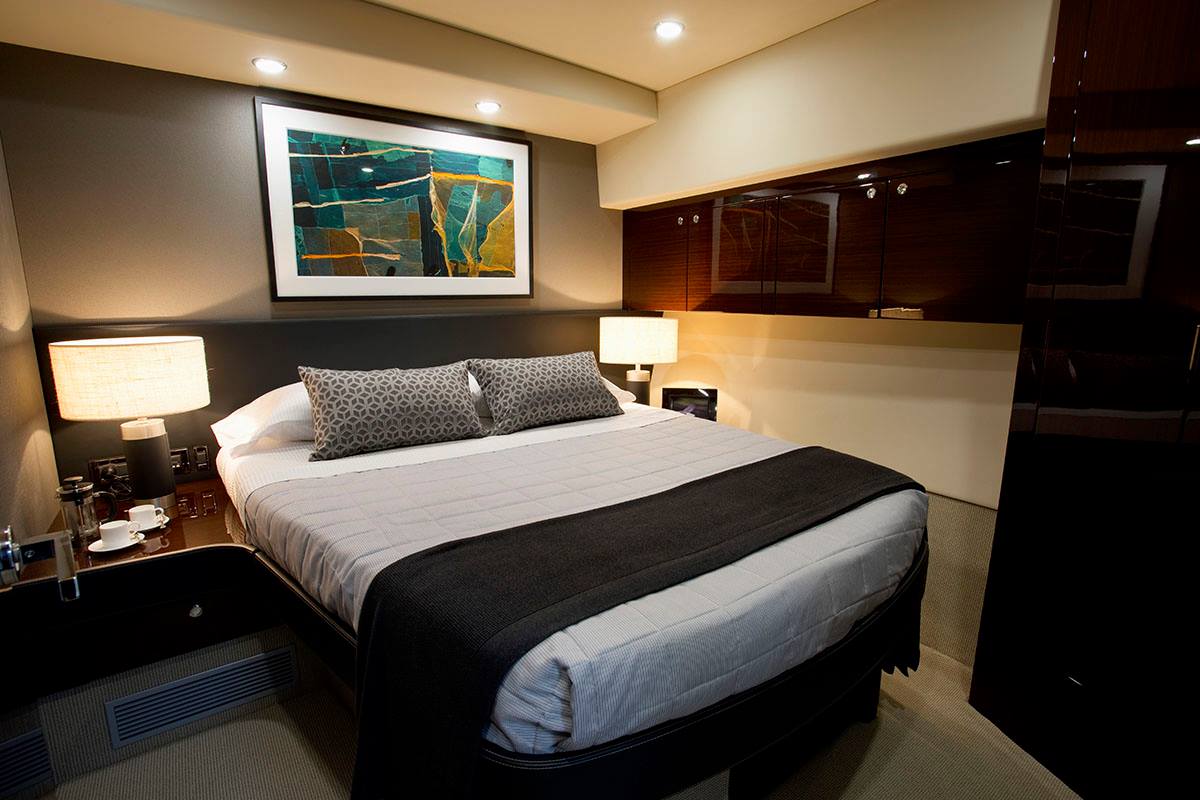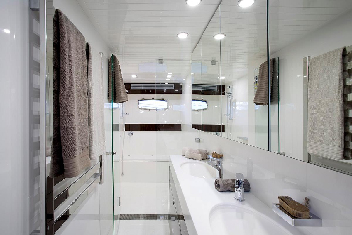 Maritimo M65’in master kamarasının ebeveyn banyosu, motoryatın altı çizilmesi gereken unsurlarından. Oldukça kapsamlı dolaplar, ayrı tuvalet, çift lavobo gibi donanımlar, motoryatın boyutlarına göre beklentinin çok üzerinde. Toplam dört kamaranın diğer ikisini ise VIP donanımlı misafir kamaraları oluşturuyor. Her bir kamarada 12 bin BTU iklimlendirme sistemleri, tik kaplı gardroplar lüks atmosferi ve konforu misafirlere yaşatıyor.