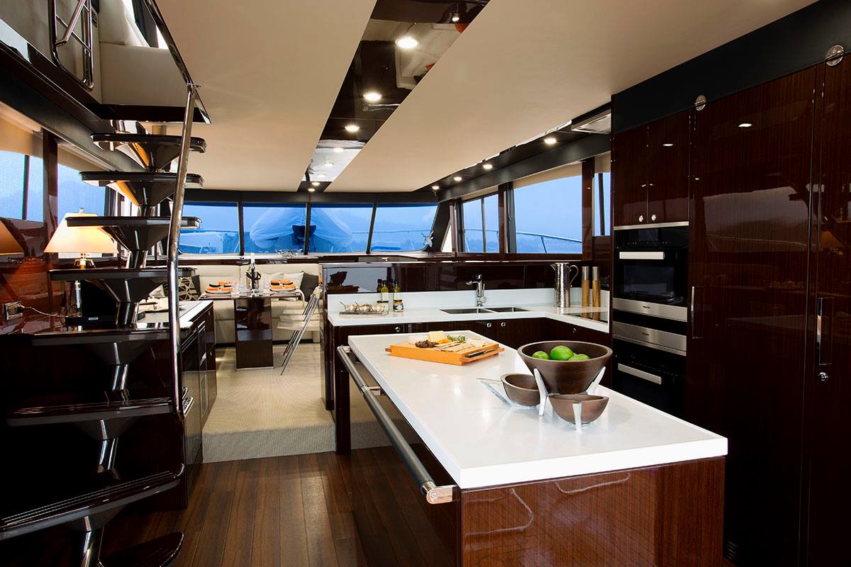 Motoryatın tüm genişliğinden faydalanan master kamarası dahil olmak üzere sahip olduğu dört misafir kamarasında M65, hayli tatmin edici konaklama kapasitesi ve yüksek standartlar sunuyor. Tam donanımlı geniş mutfağında da Miele marka mutfak ekipmanları tercih edilmiş. Çift kapaklı buz dolabıyla birlikte 25 şişelik özel şarap dolabı ve LED ambiyans aydınlatmaları mutfağın başlıca özellikleri arasında.