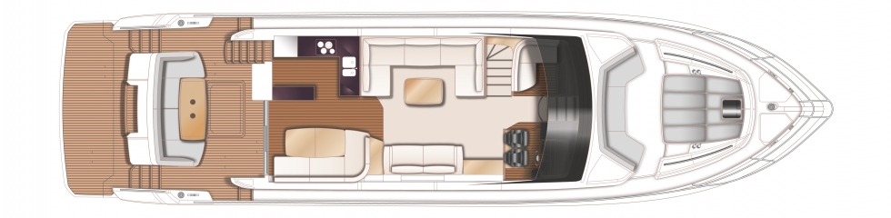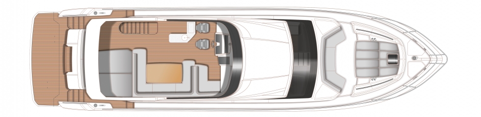 Güvertede yer alan geniş yemek masasında 8 kişi rahatlıkla yemek yiyebiliyor. Baş tarafta da şık bir oturma alanı var. Oturma alanında aynı zamanda geniş güneşlenme minderleri bulunuyor. Flybridge’deki dümen istasyonunun karşısında 5 kişilik oturma grubu düşünülmüş. Tam donanımlı wet bar, 68’in flybridge’ini benzersiz kılan diğer bir özelliği. Flybridge’in ön tarafındaki oturma grubu, istenildiği zaman güneşlenme minderine de dönüşebiliyor.
