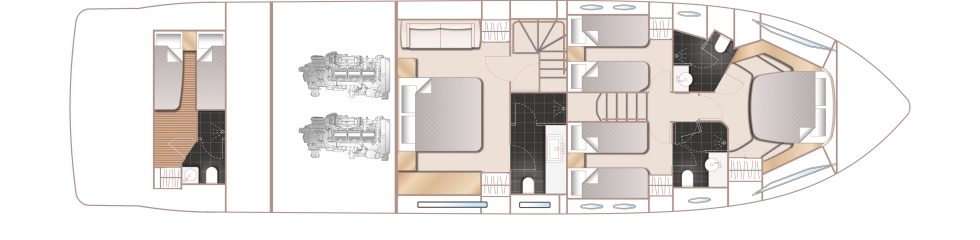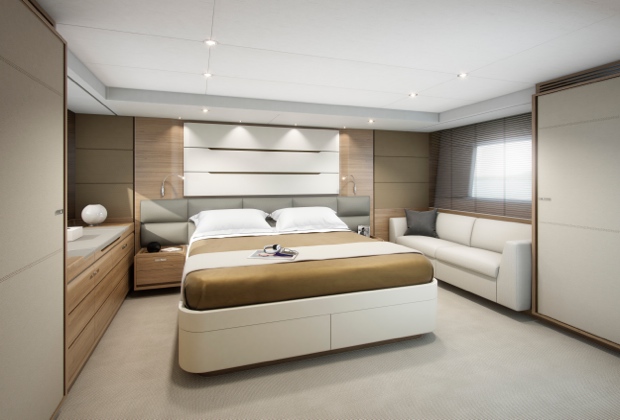 68’in master yatak odasının girişine ek olarak ayrı bir lobby kısmı düşünülmüş. Teknenin baş tarafında doğru konumlanan misafir kabinlerine geçiş ise ayrılmış.